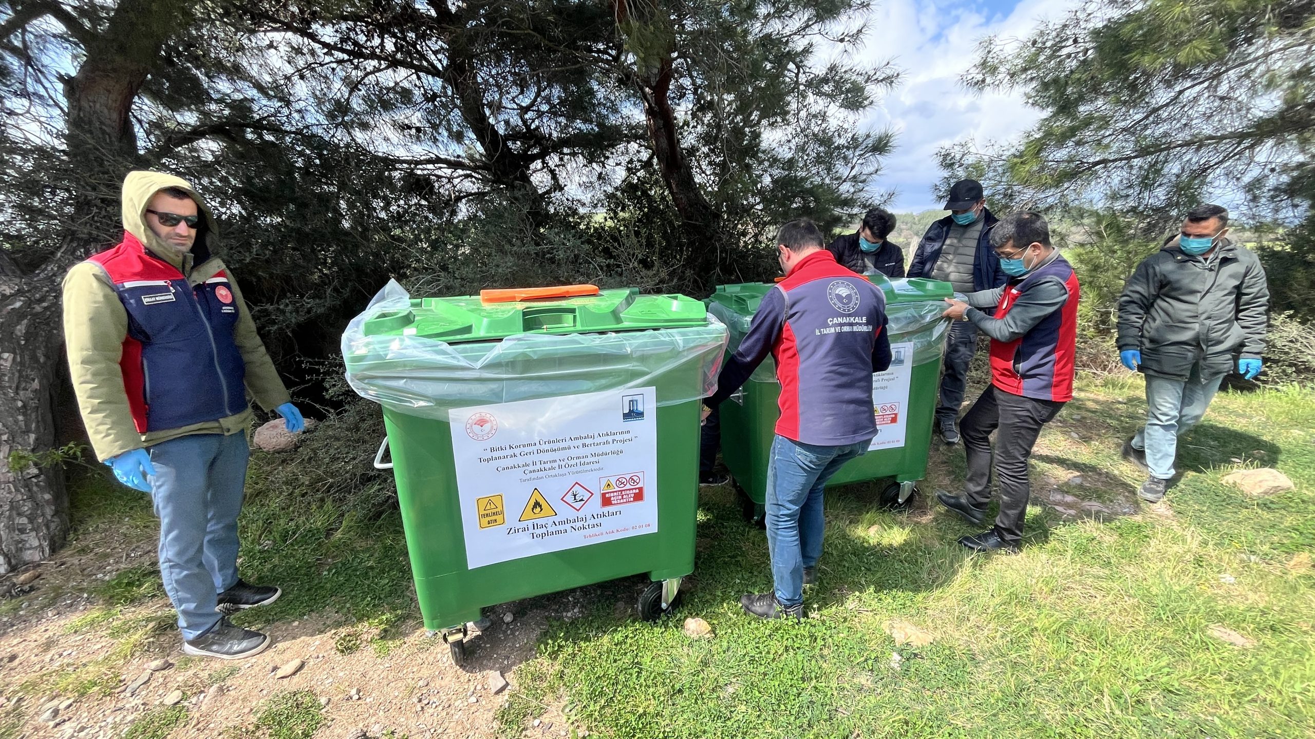 Çanakkale Tarım ve Orman Müdürlüğü koordinasyonunda yürütülen proje kapsamında tarla, bağ ve bahçelerde kullanılan zirai ilaç ambalajları, üreticiler tarafından yeşil renkli konteynerlerde toplanarak lisanslı tesislere gönderilmeye başlandı.