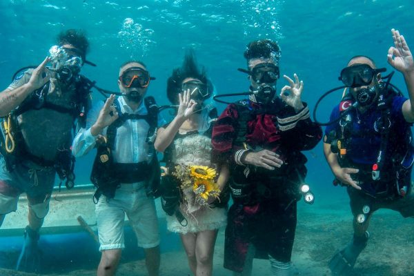 Çanakkale’nin Gelibolu ilçesinde deniz tutkunu çift, su altında evlendi.