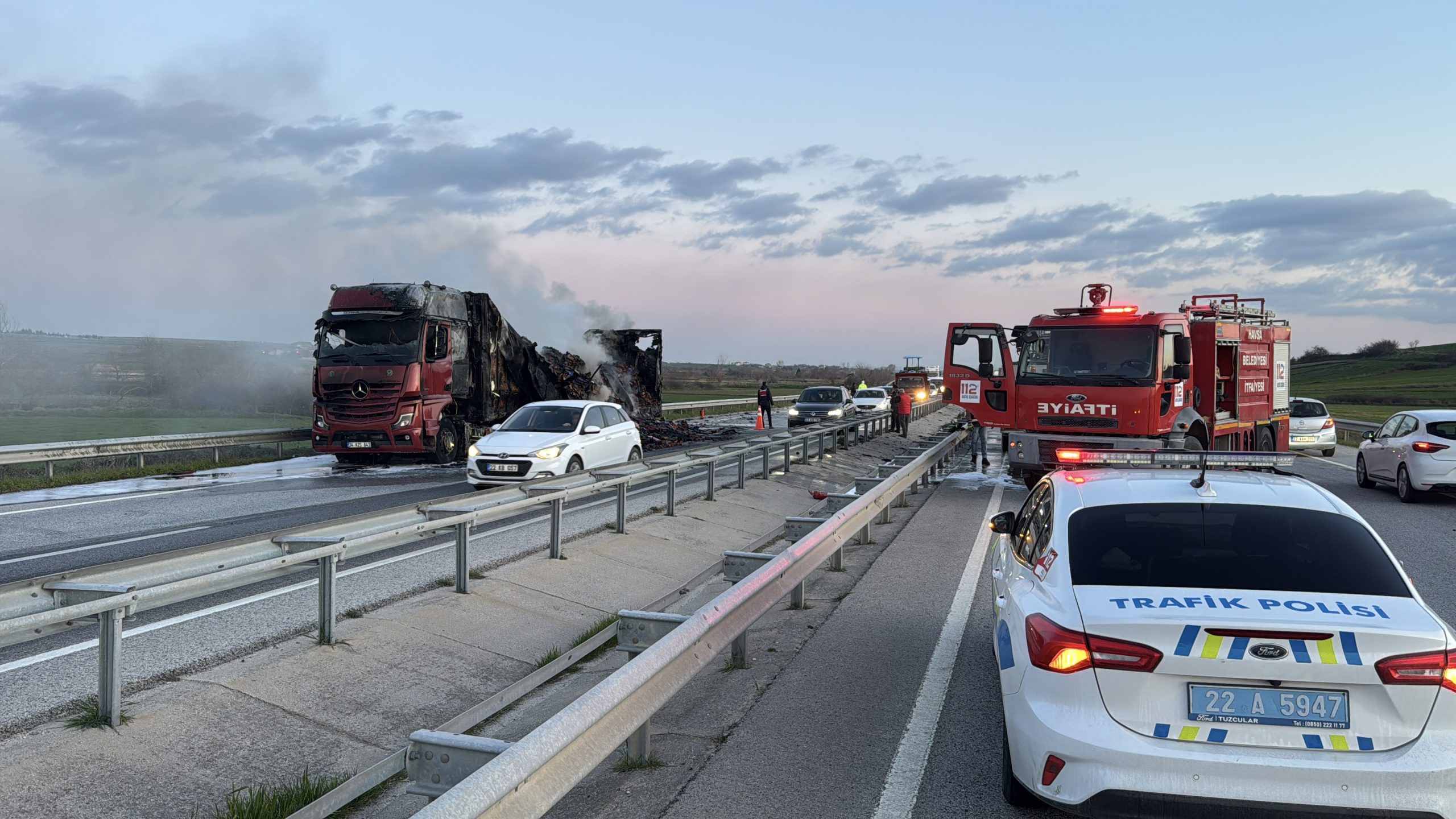 Alevlerin büyümesi üzerine sürücü tırı yolun kenarına park ederek yangına müdahale etmeye çalıştı ve itfaiye ekiplerine haber verdi.