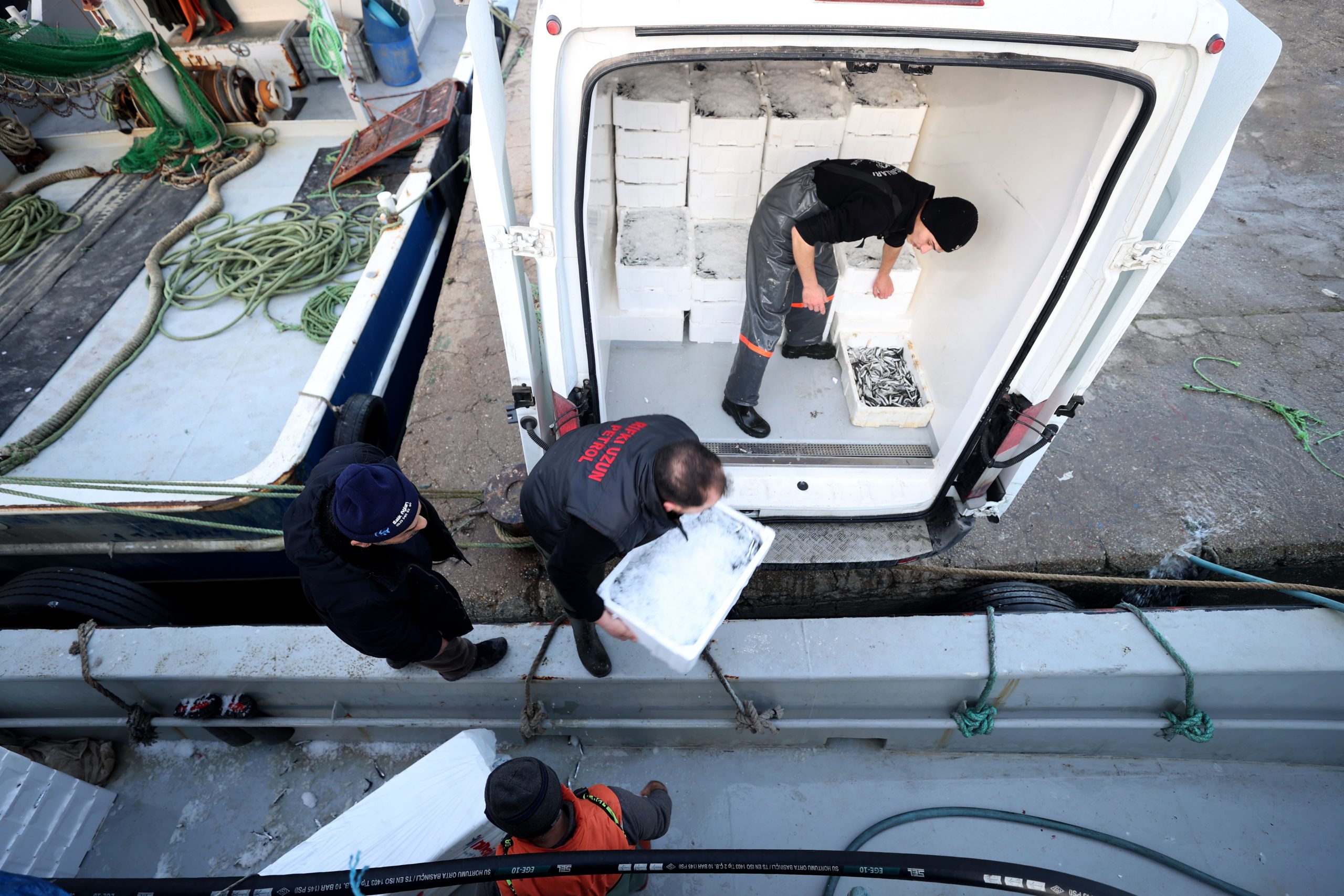 Limana getirilen hamsiler, balıkçı teknelerinden kamyonlara yüklenerek İstanbul’a sevk ediliyor.