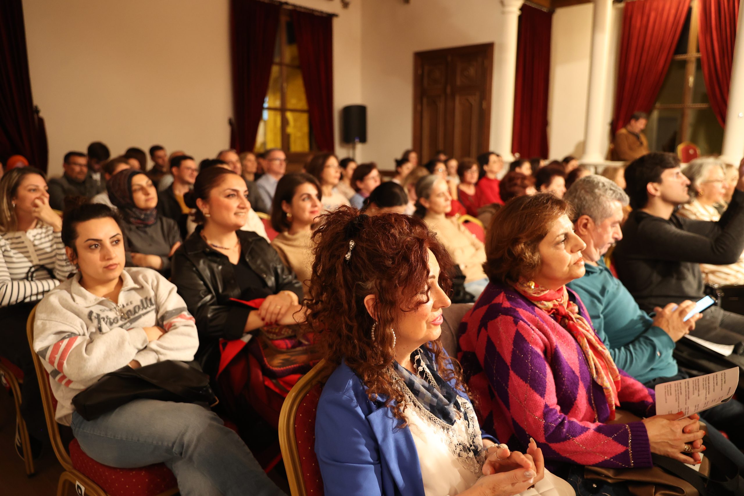 Konuşmaların ardından topluluk, “Gel gitme kadın ruhumu hicrana bırakma”, “Gece kirpikli kadın”, “Bak şu dilber kadına saçlarını yandan ayırmış”, “Şimdi uzaklardasın”, “Şarkılar seni söyler dillerde nameler”, “Sevdim bir genç kadını” gibi muhayyerkürdi, kürdilihicazkar, hicazkar, suzinak, nihavent makamlarında şarkılar seslendirdi.