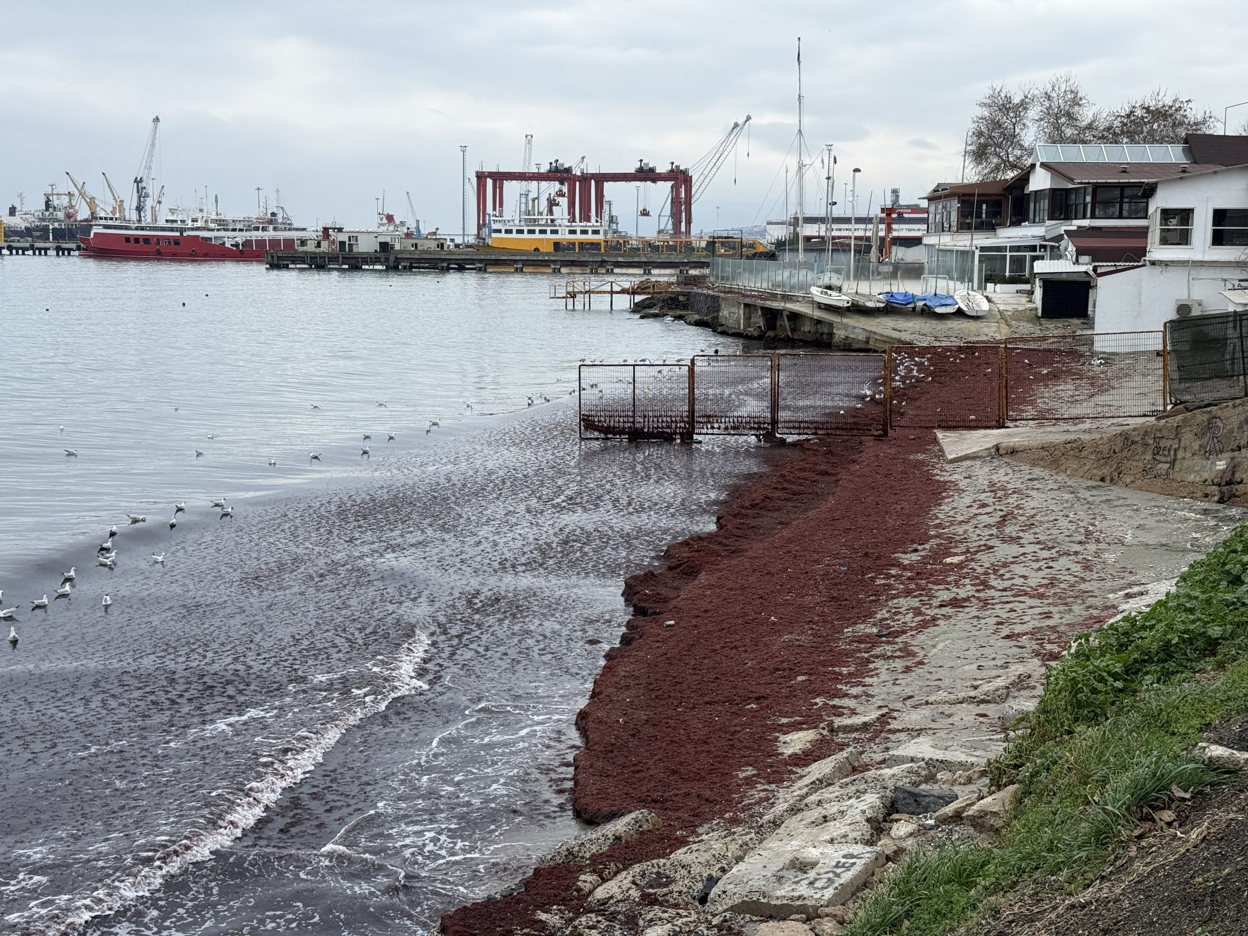 Tekirdağ’da kuvvetli rüzgar nedeniyle sahilin bir kısmında kırmızı yosun birikti.