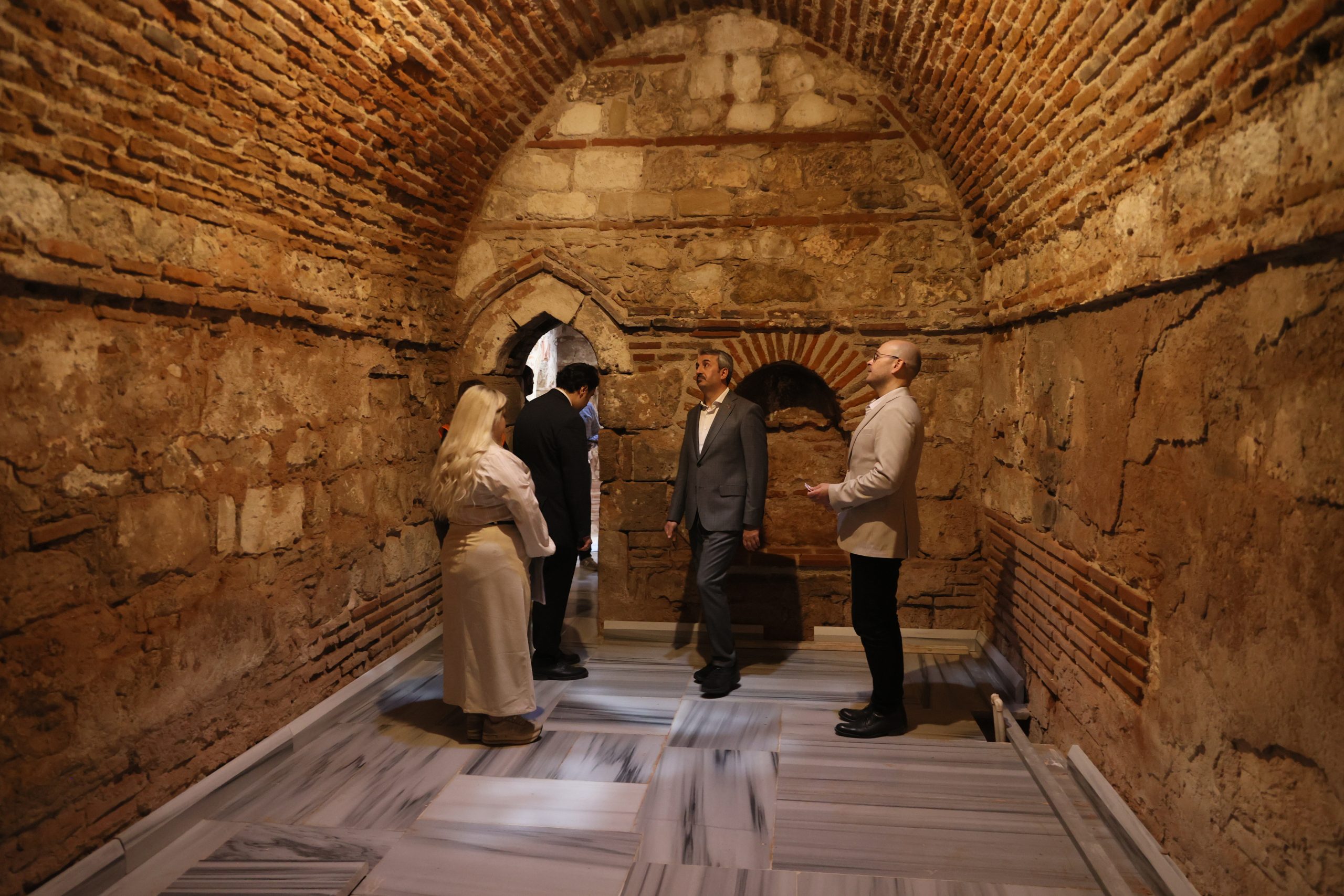 Kesme taş ve tuğla malzemeden inşa edilen hamamın duvarları büyük ölçüde orijinal dokusunu koruyor.